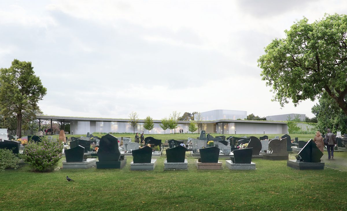 Le bâtiment a été conçu de plain-pied, à l’architecture marquée par des lignes horizontales et une géométrie courbe. Cette composition permet une intégration maîtrisée dans un environnement sensible, entre cimetière et équipements existants.